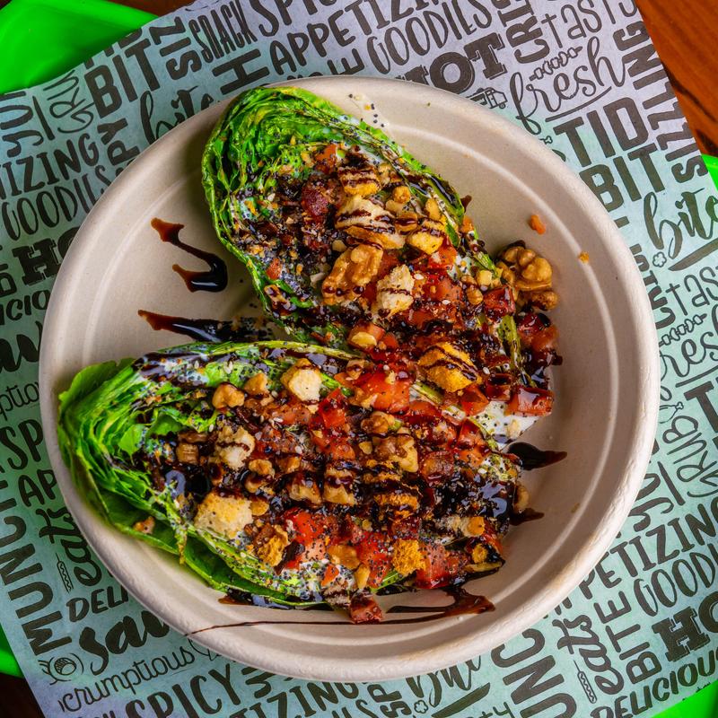 Fresh cut Brussels sprouts seared crunchy in roasted garlic oil, caramelized onion, bacon, tossed in agave and balsamic glaze and topped with crushed pistachios.